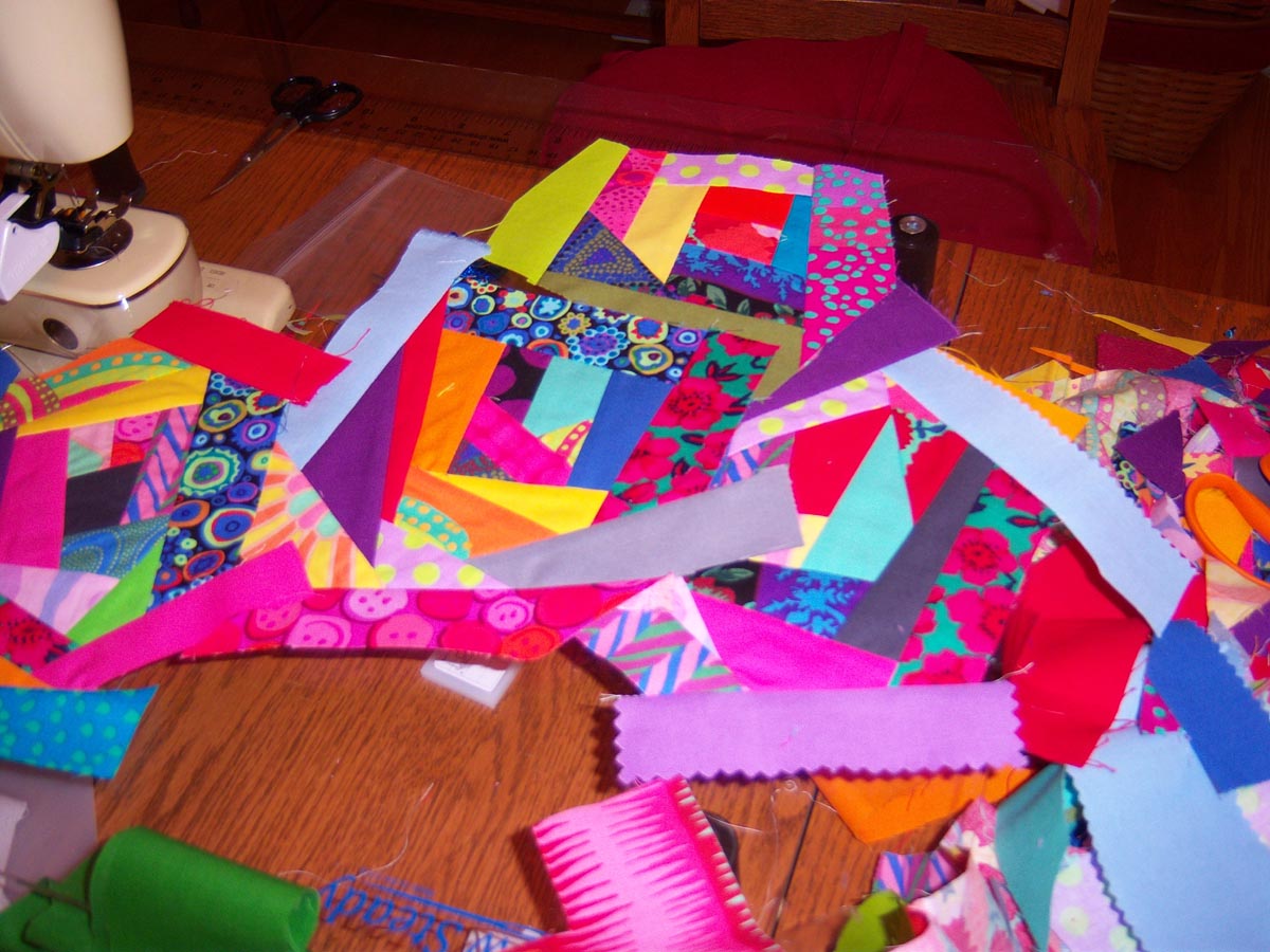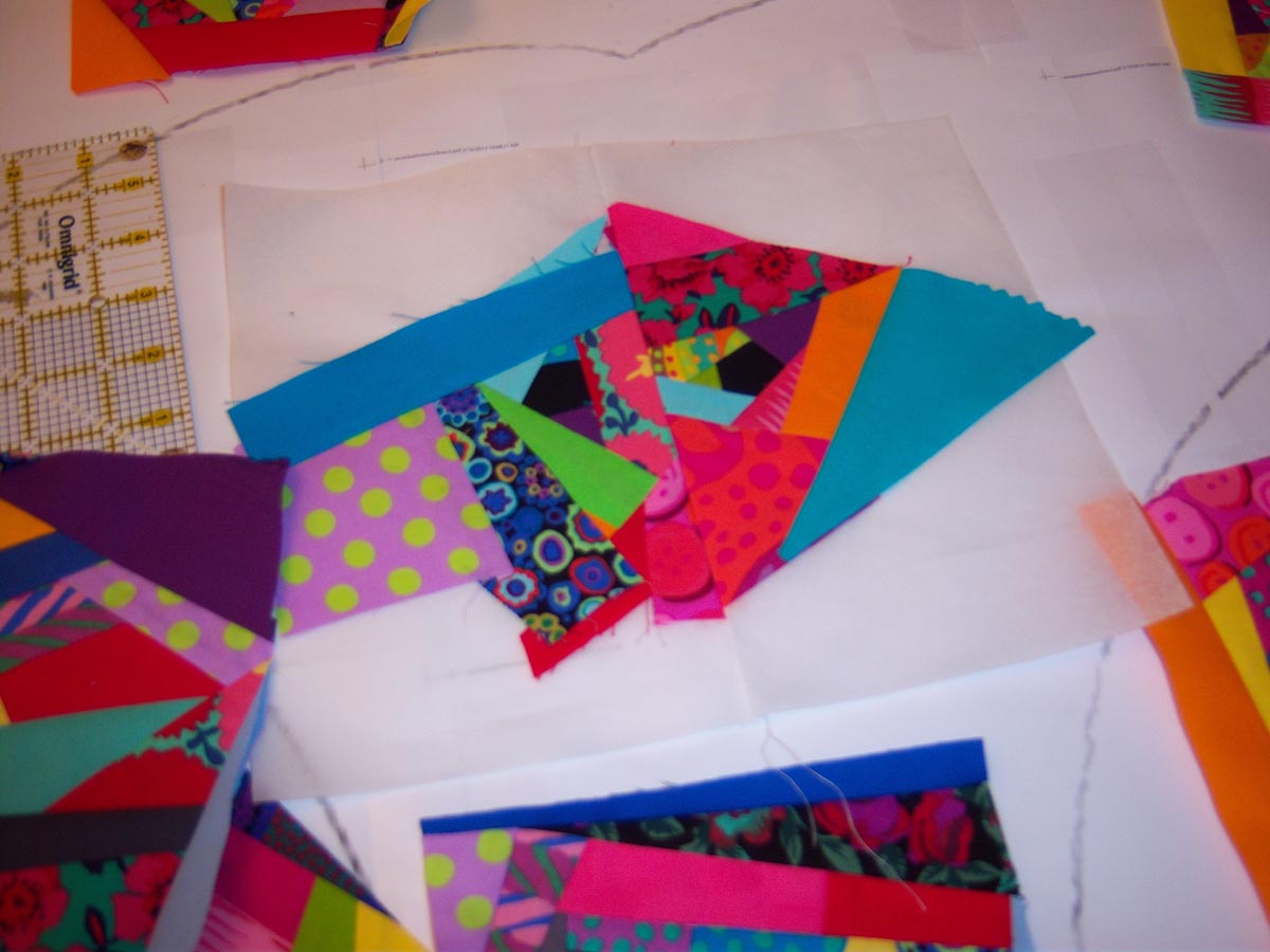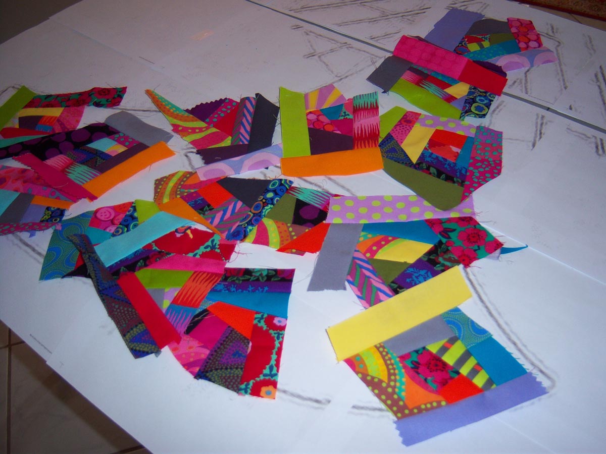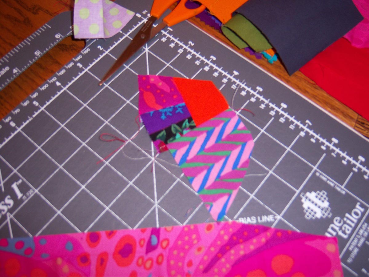 I did not want to use just one solid or print type fabric for the face. I used the 15 Minutes of Play by Victoria Findlay Wolfe. The first day it was a bit rough letting go and just random piece, sew and cut. The second day, was easier and became free and fun…. getting the hang of this.