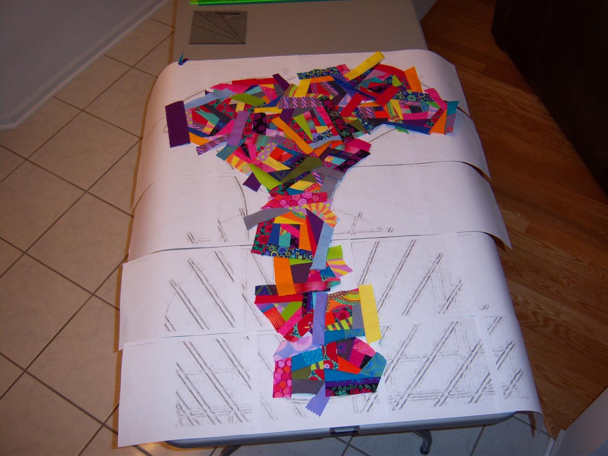 Put it on the long arm machine to do the background quilting that is similar to the piecing of the face. Some of the quilting was also done on my domestic machine.